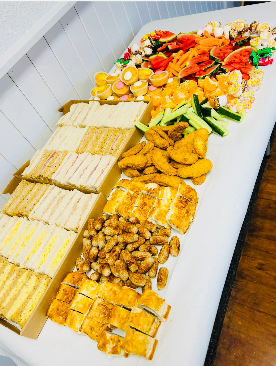 Buffet includes: Selection of sandwiches on white sliced bread - egg mayonnaise, cheese, tuna mayonnaise and ham. Sausage rolls and mini sausages. Fruit platter - melon, grapes, satsumas, kiwi and strawberries